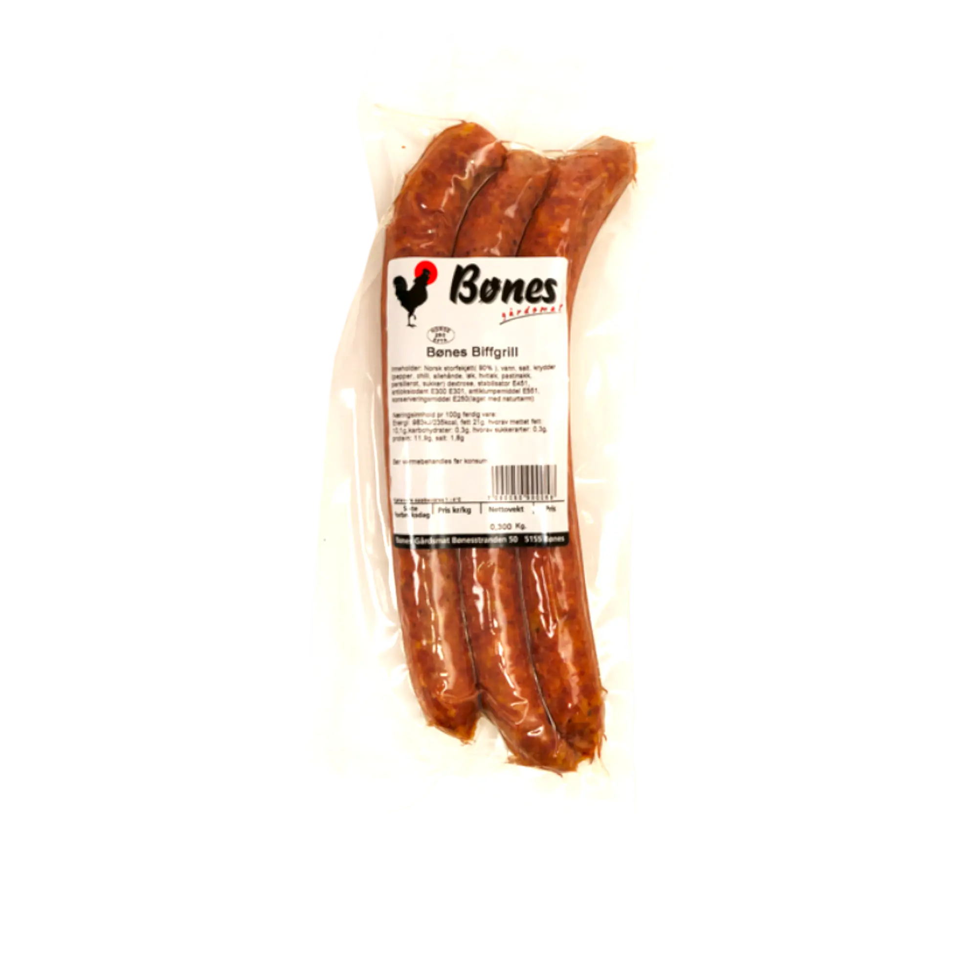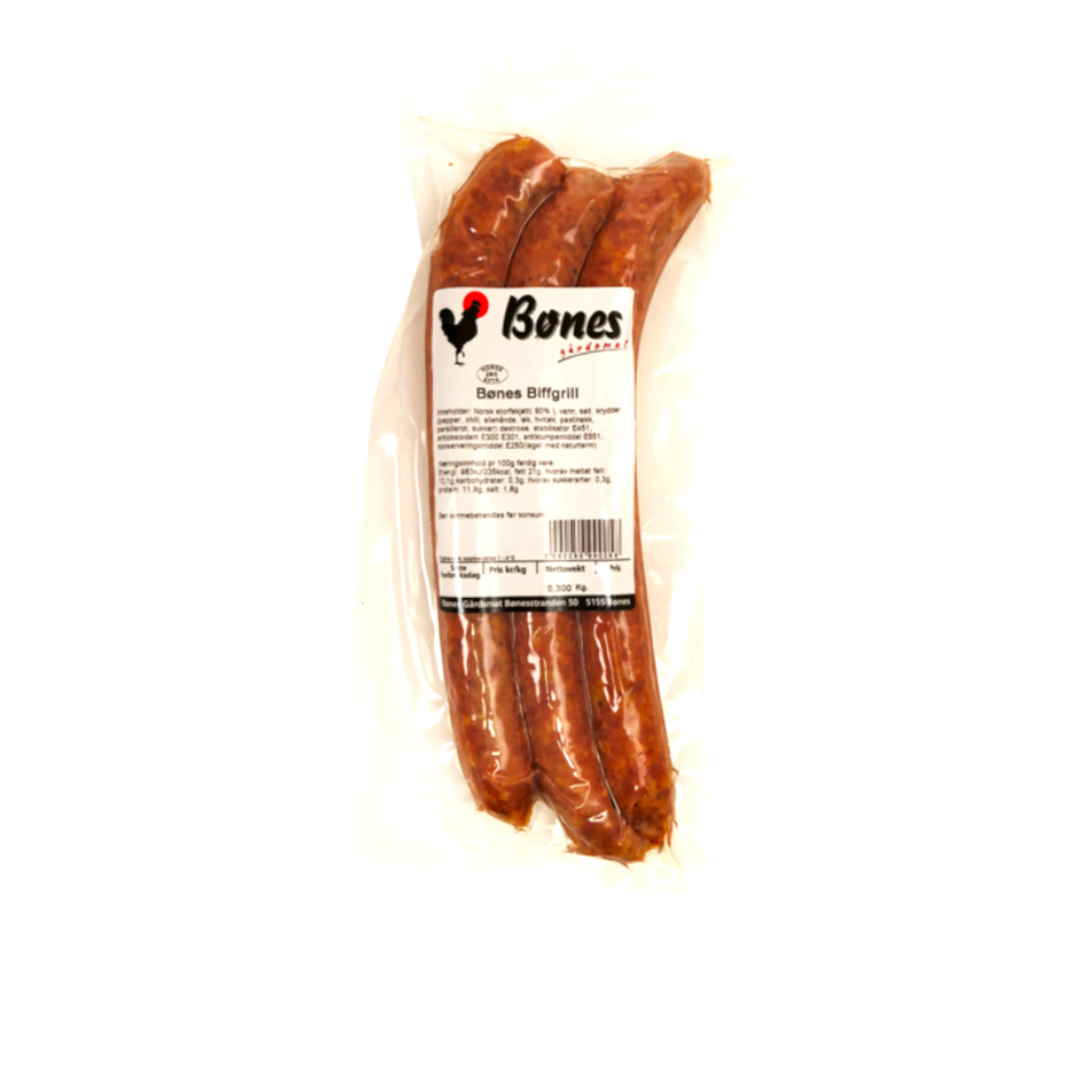 Norsk storfekjøtt, vann, salt, krydder(pepper, chilli, allehånde, pastinakk, persillerot, sukker, løk, hvitløk, naturlig aroma, konsistensmiddel E551), stabilisator E451, glukose, antioksidant E300 E301, konserveringsmiddel E250