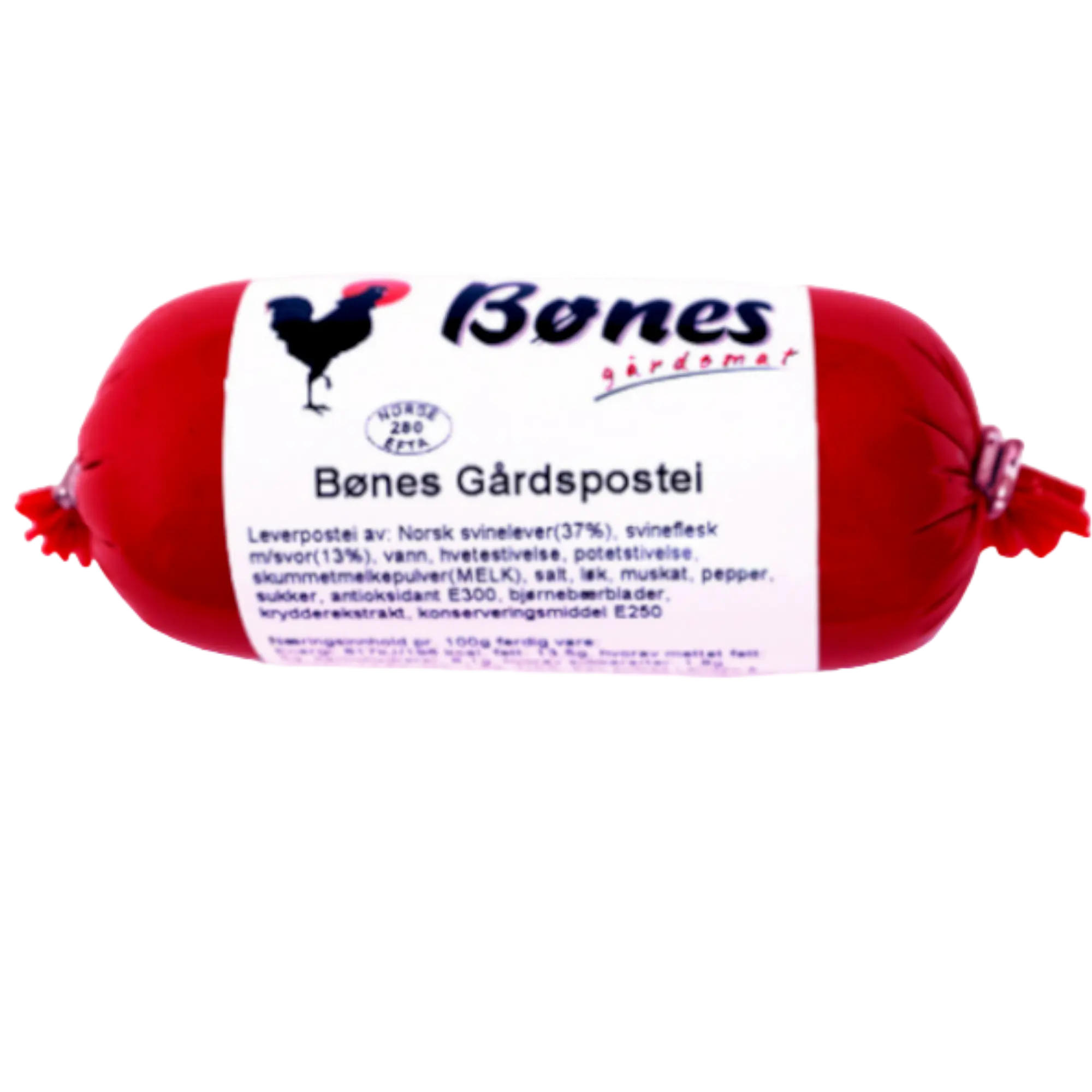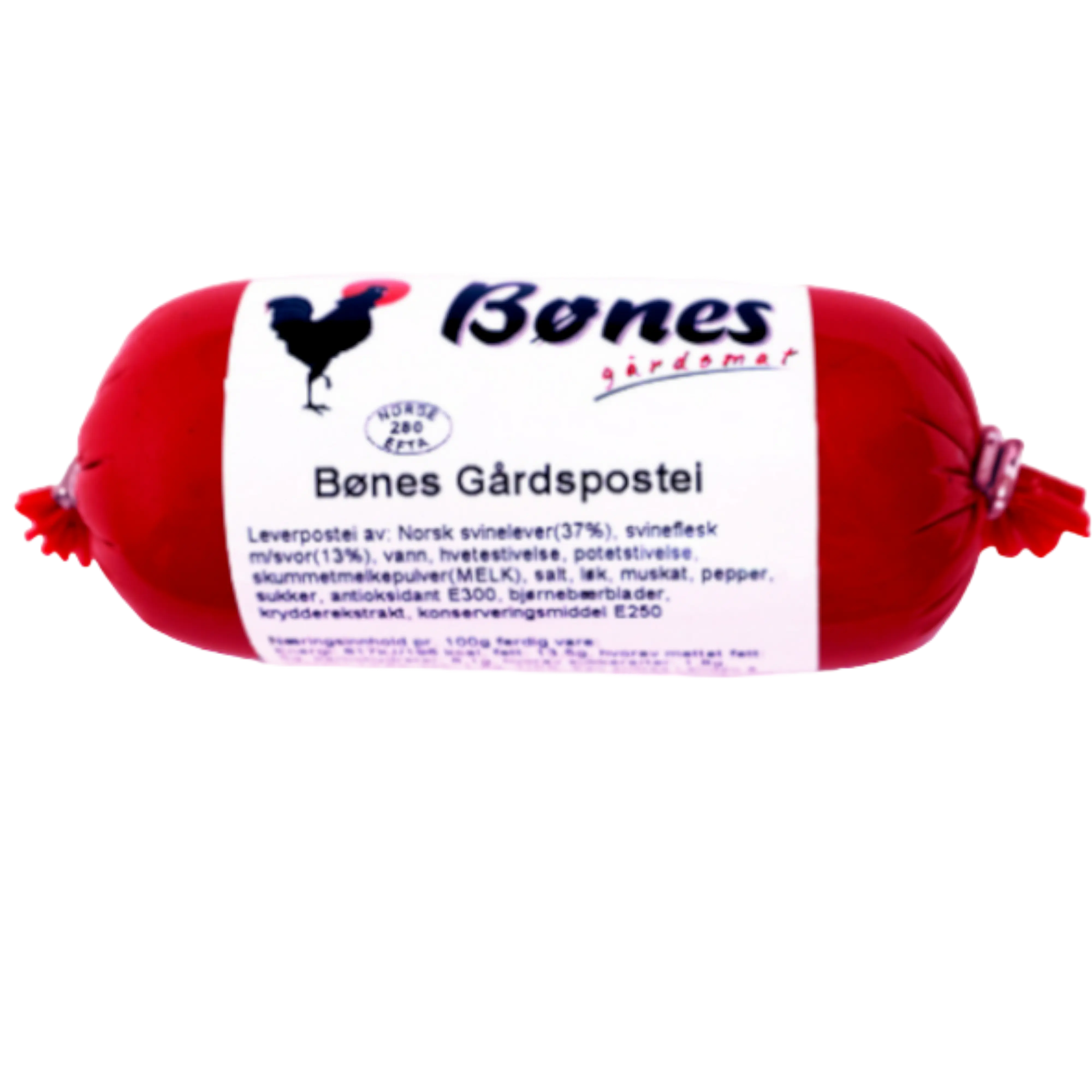 Lever av svin, svineflesk, vann, hvetestivelse, potetstivelse, skummetmelkepulver, salt, løk, dexterose(mais), muskat, pepper, sukker, antioksidant E300, bjørnebærblader, krydderekstrakt, konserveringsmiddel E250