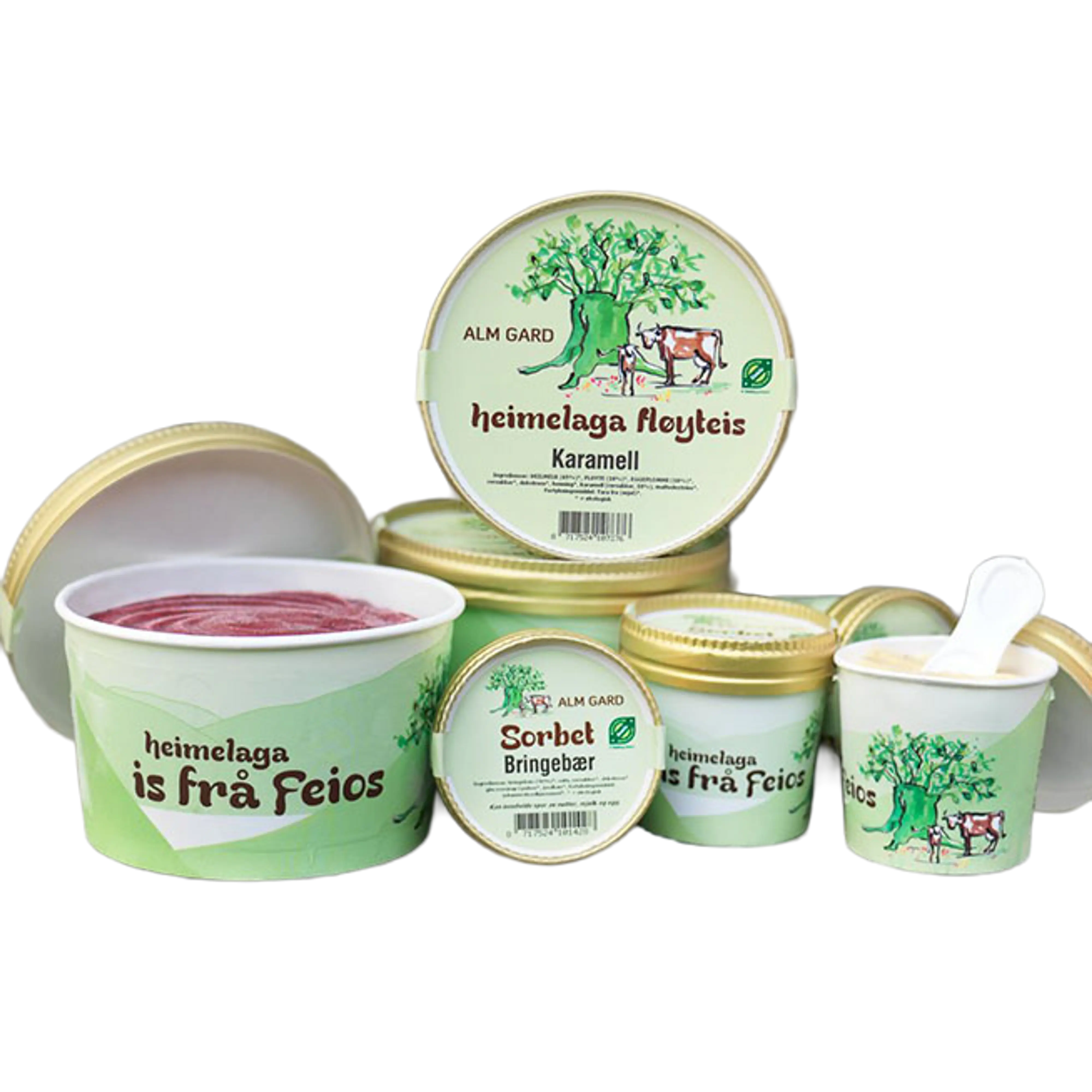 Bringebærsorbet lagar me av vår eigen bringebær. Guus har ansvaret for bringebærdyrkinga på gården. Me har valgt å dyrke det tradisjonelle Norske rasen Veten. Denne typen har ein nydeleg syrleg smak, som passar perfekt til isen vår. Me plukkar ikkje bærene før dei er heilt modne og mørke i fargane. Smak og farge rett frå naturen. Sorbetisen inneheld 40% bær.