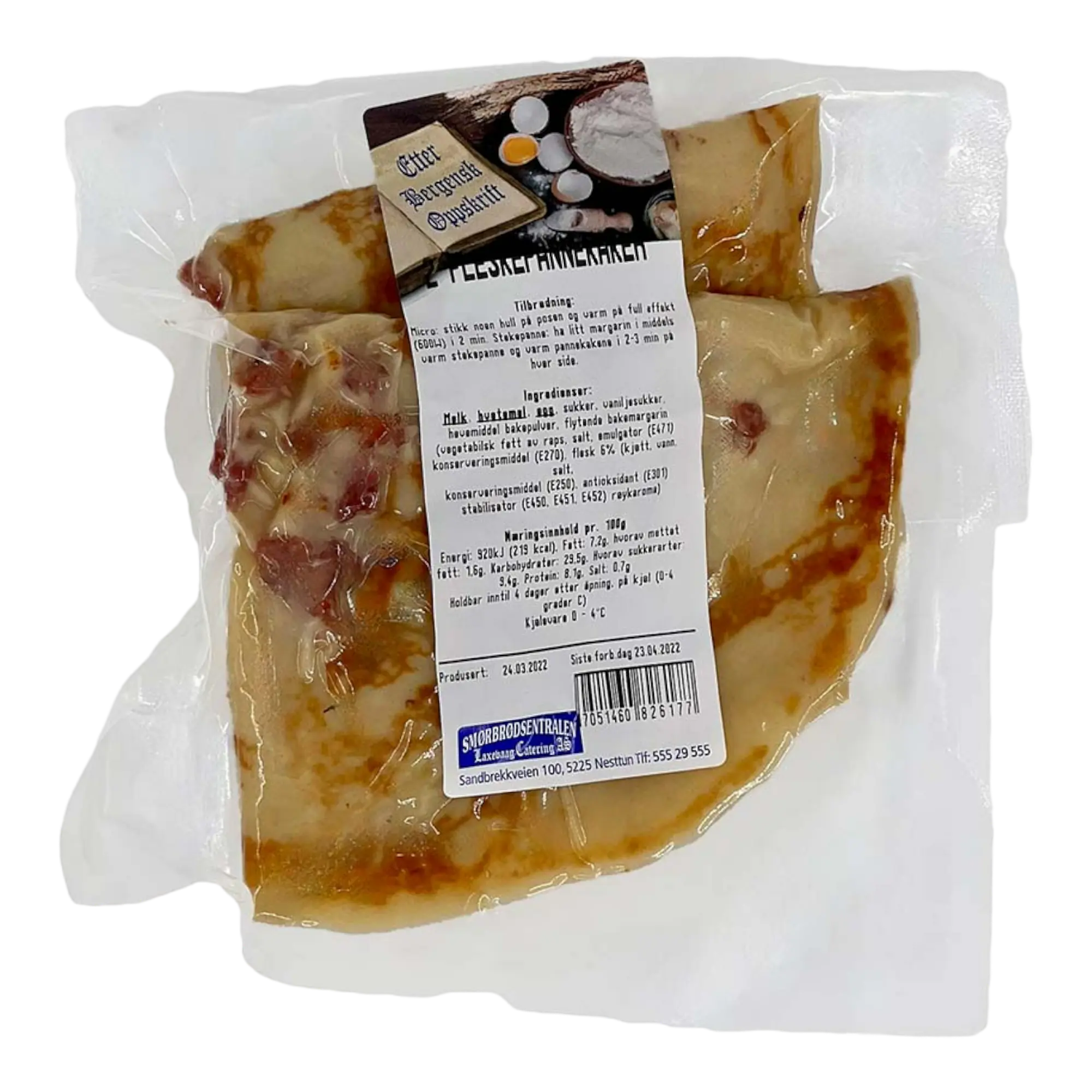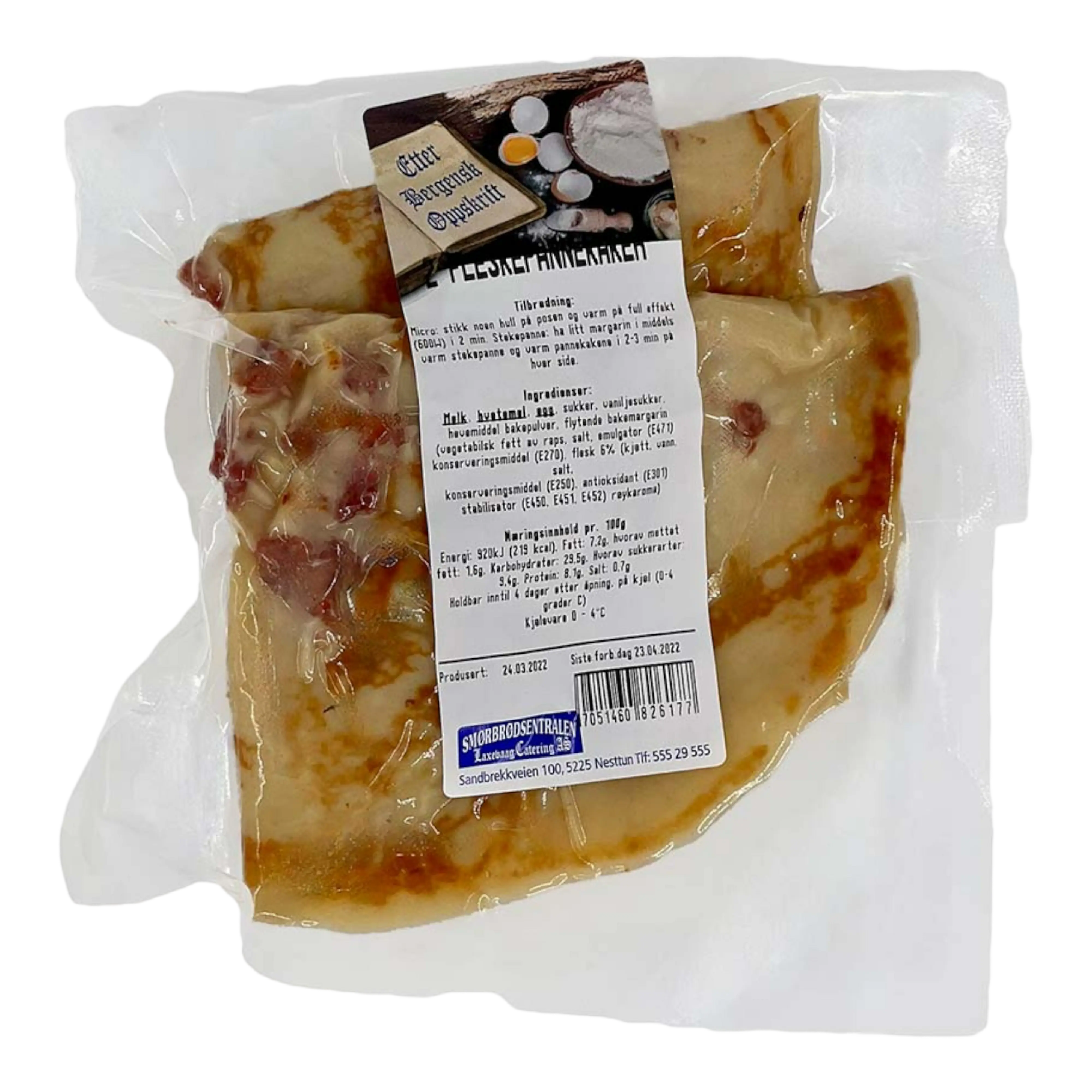 Pannekaker er en favoritt til middag for både voksne og barn, og fleskepannekaker, altså pannekaker med bacon, er intet unntak! Du får 2 pannekaker i hver pakning. Tilberedning: (Mikro) Stikk noen hull på posen og varm på full effekt i 2 min, (Stekepanne) Ha litt margarin i en middels stekepanne og varm pannekakene i 2-3 min på hver side.