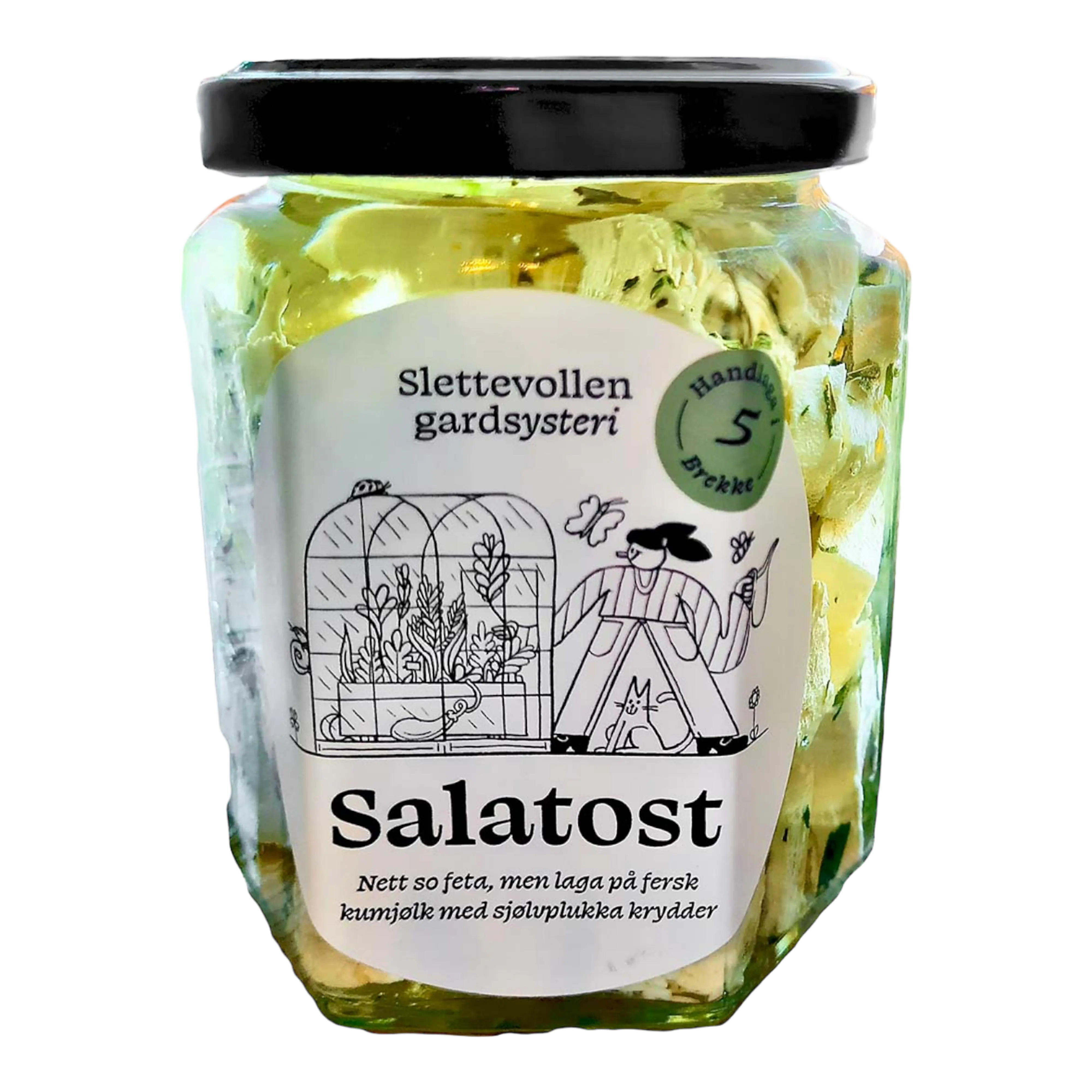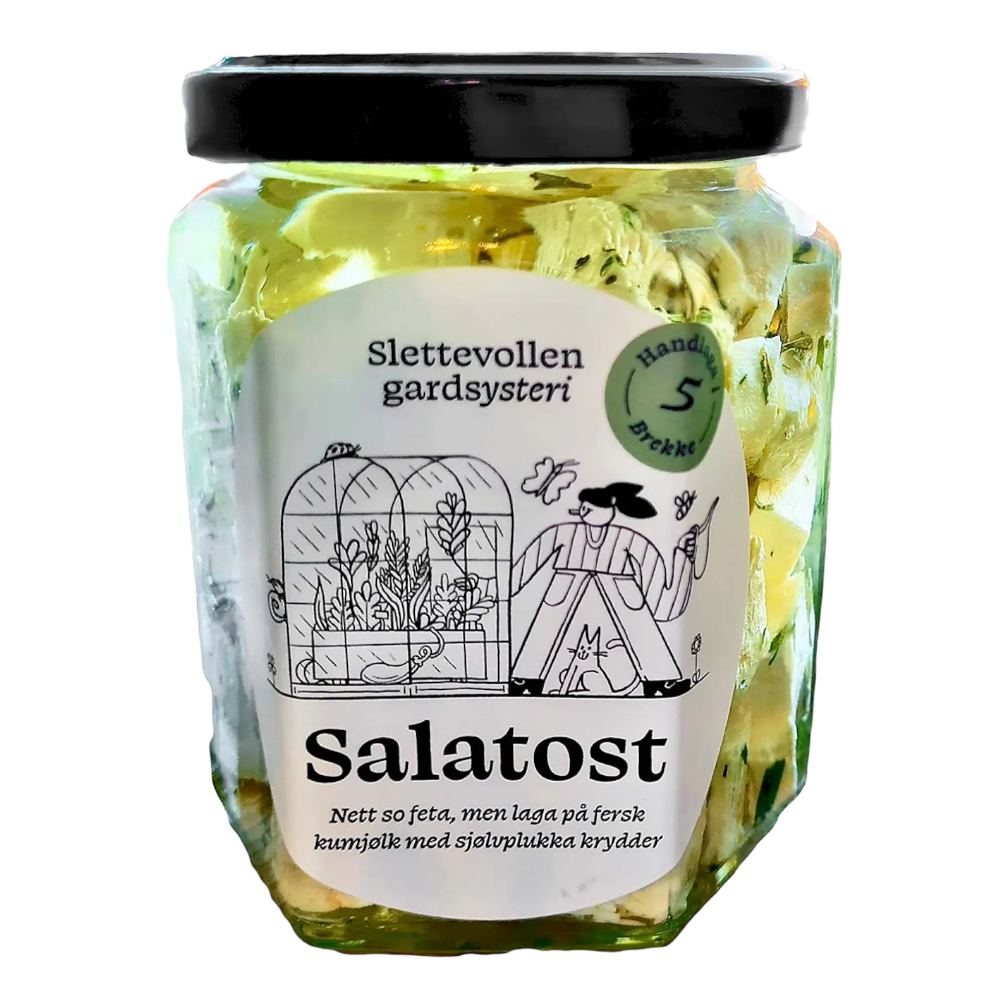 Nett so feta, men laga på den ferske mjølka frå kyrne ved Slettevollen gard i Brekke. Bitar av salatosten ligg på glas (390 ml) i rapsolje saman med sjølvplukka og tørka ramsløk.