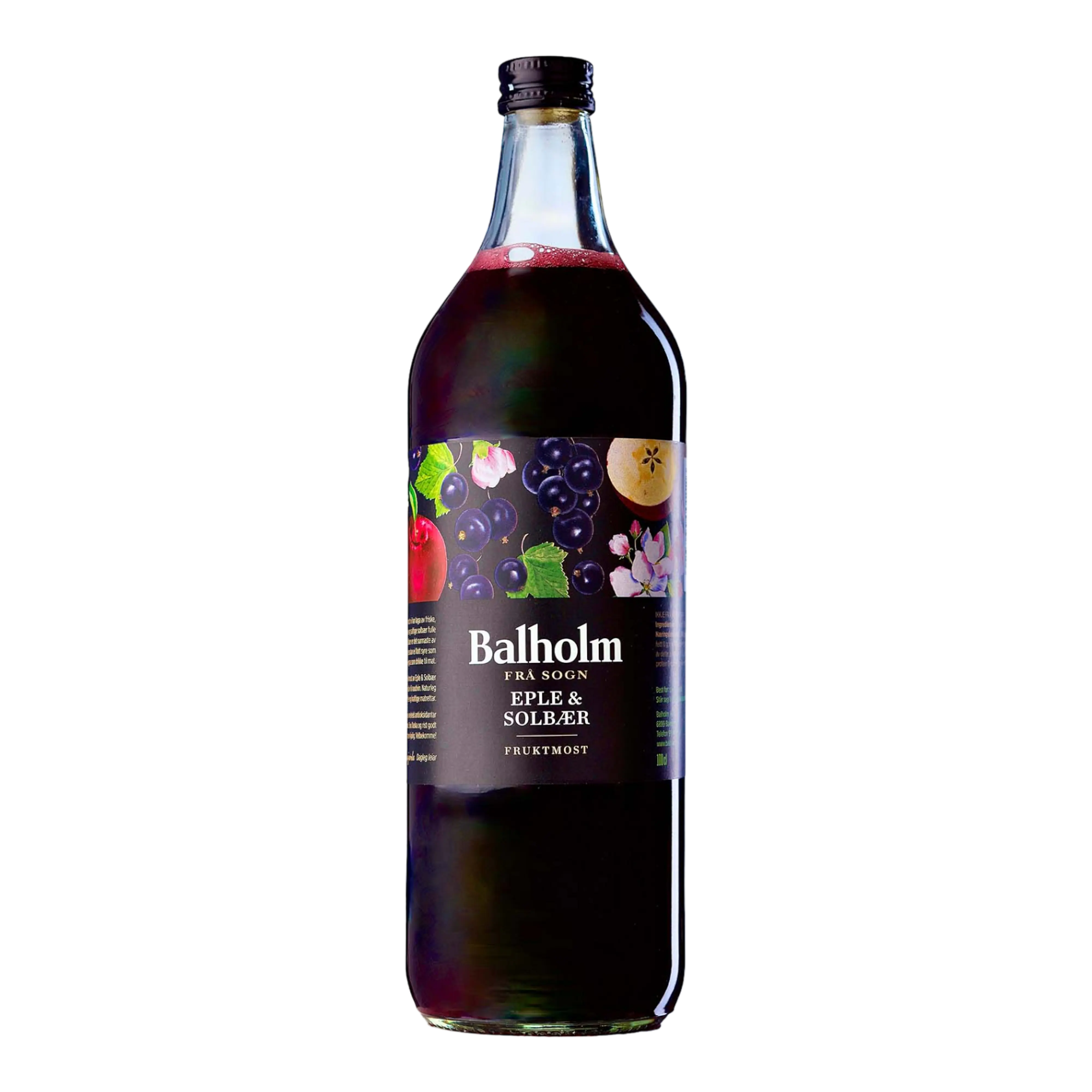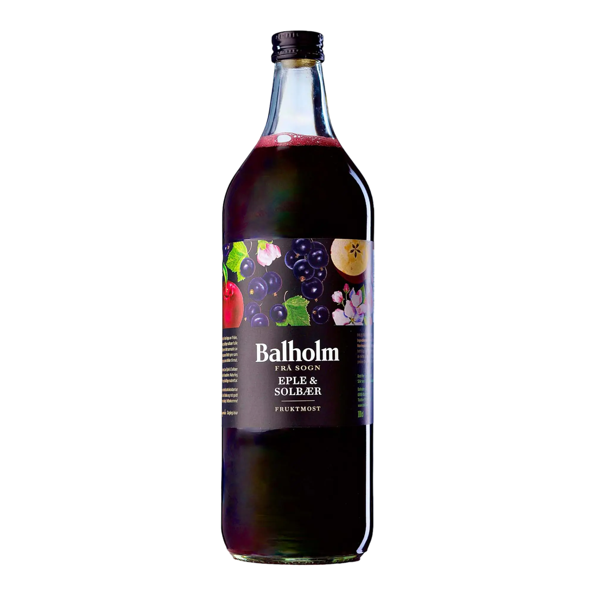 Fruktmost av friske eple og solbær. Solbær er det sunnaste av hagebæra og har ei flott syre som gjer den veleigna som drikke til mat. Balholm fruktmost av eple og solbær er eit godt alternativ til raudvin. Passar til litt feite og kraftige matrettar.