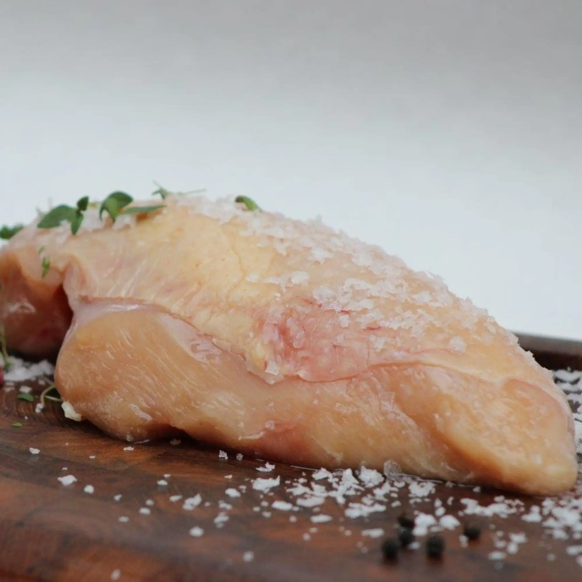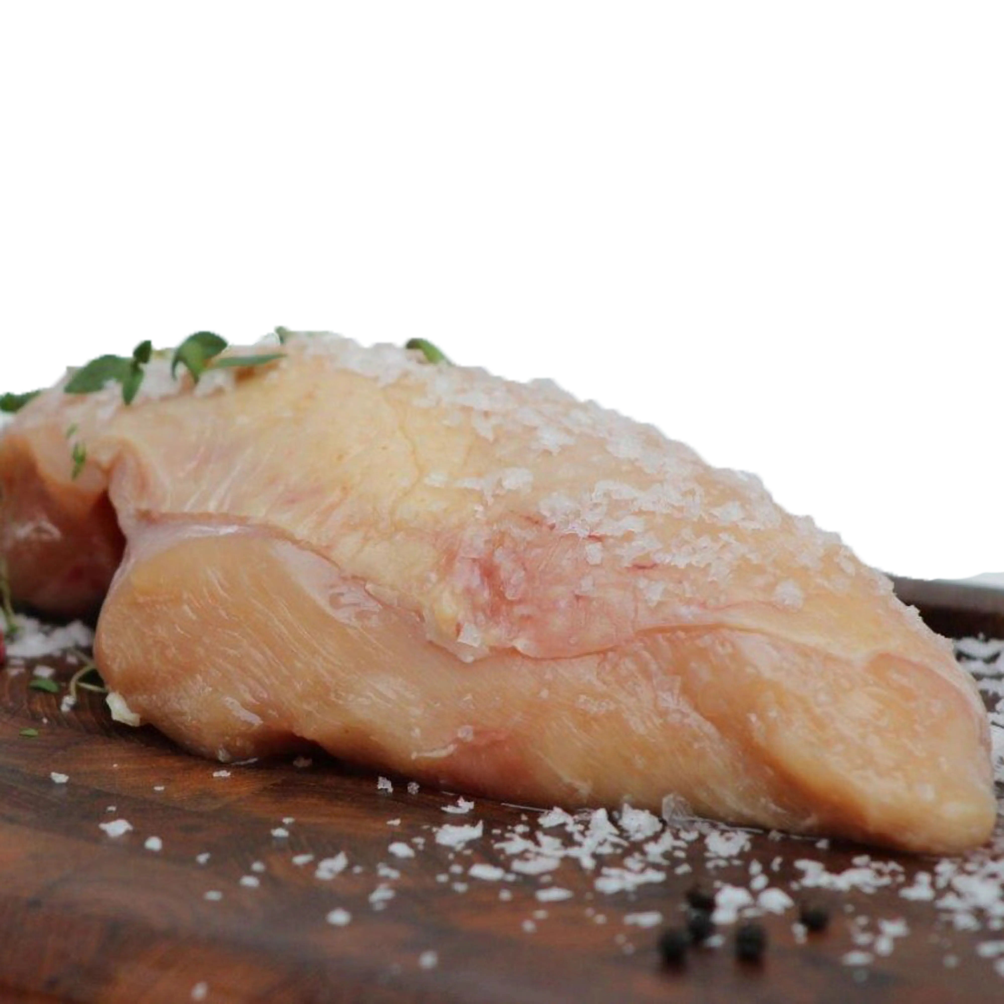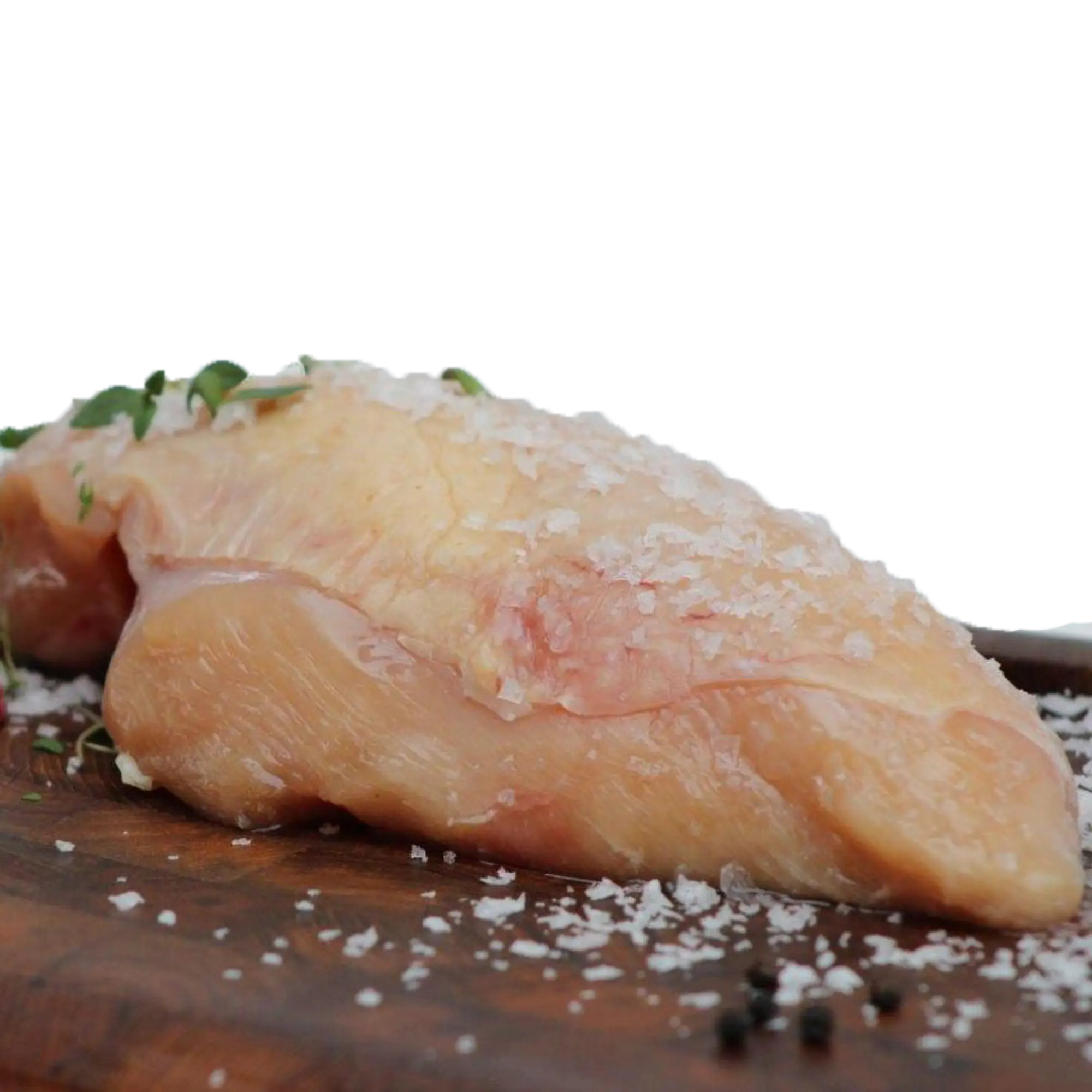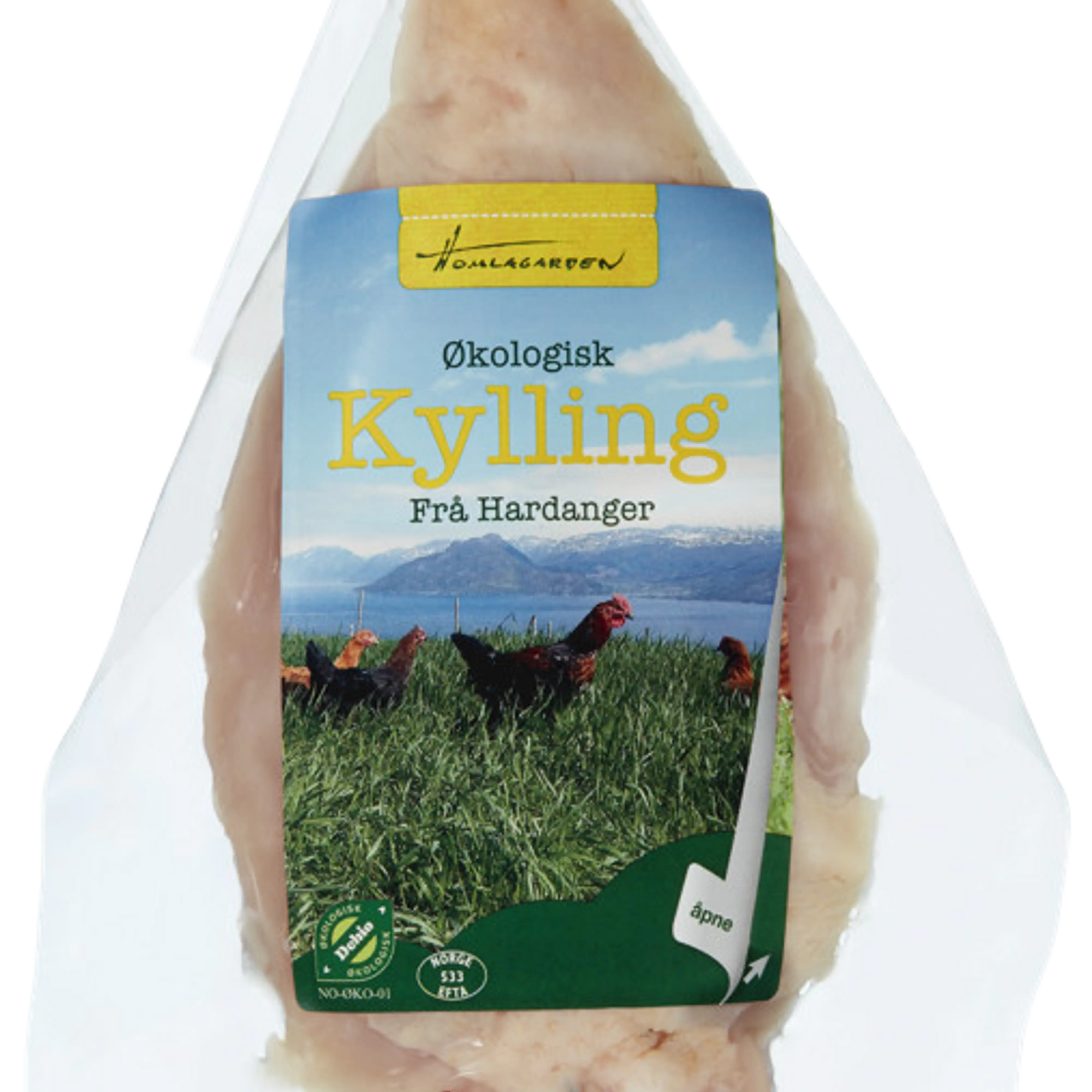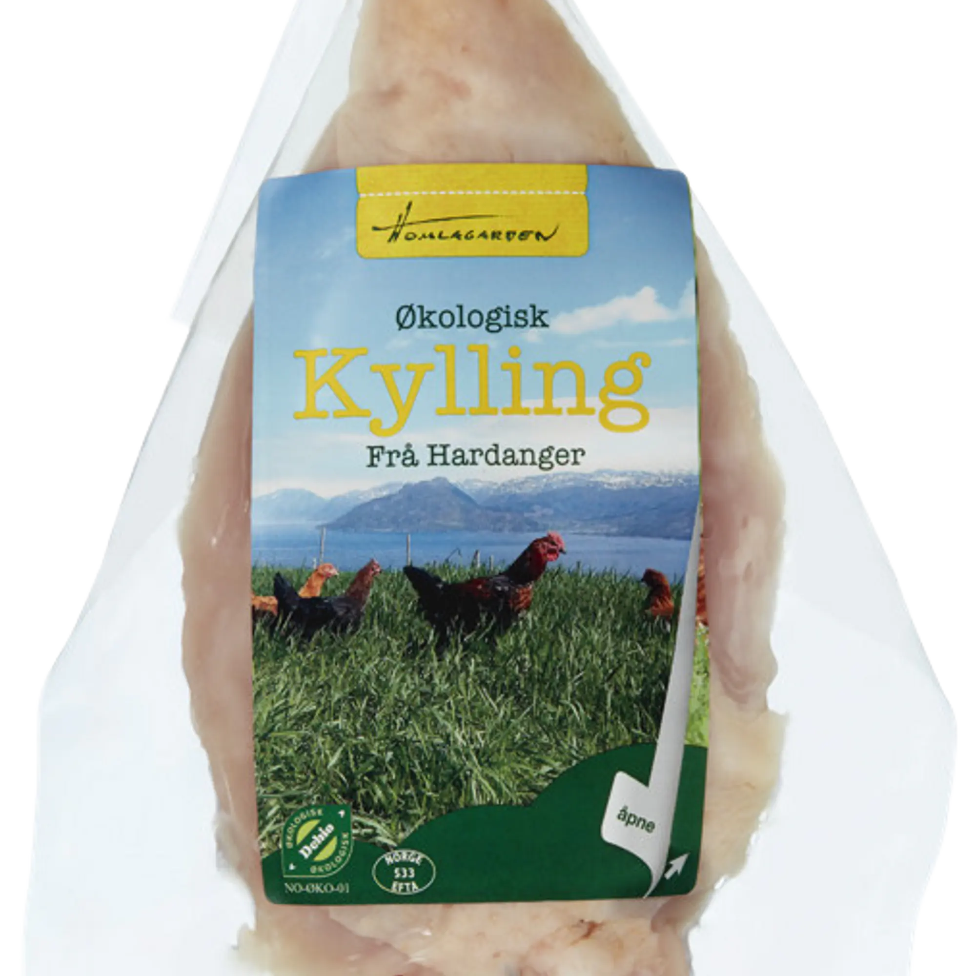 Økologisk kyllingbryst med skinn fra Homlagarden. Et bryst med vekt på ca 290g. Homlagarden leverer økologiske kylling- og kalkunprodukter av toppklasse. Vinner av norsk måltid i 2018 i klassen 'årets kjøtt' og vinner av 'årets produsent' under Matprisen 2019.
