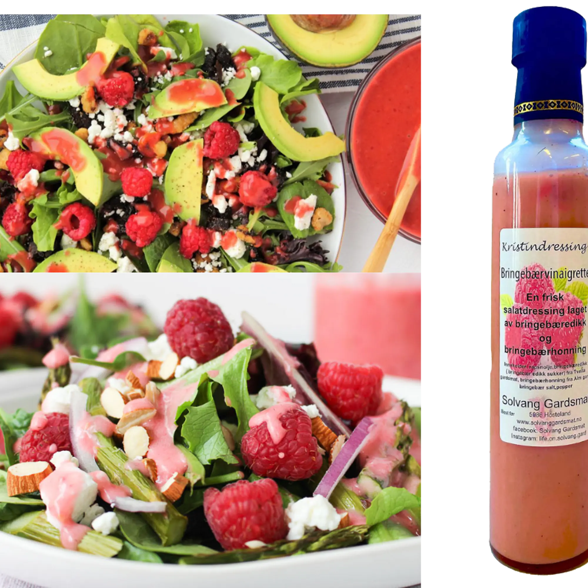 Inneholder Norsk rapsolje, bringebæreddik (eddik, bringebær, sukker) fra Tveita gard og bringebærhonning fra Alm gard, salt og pepper.