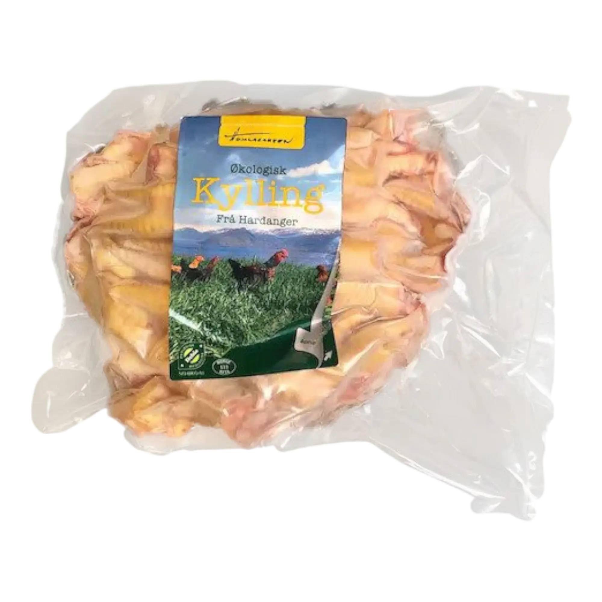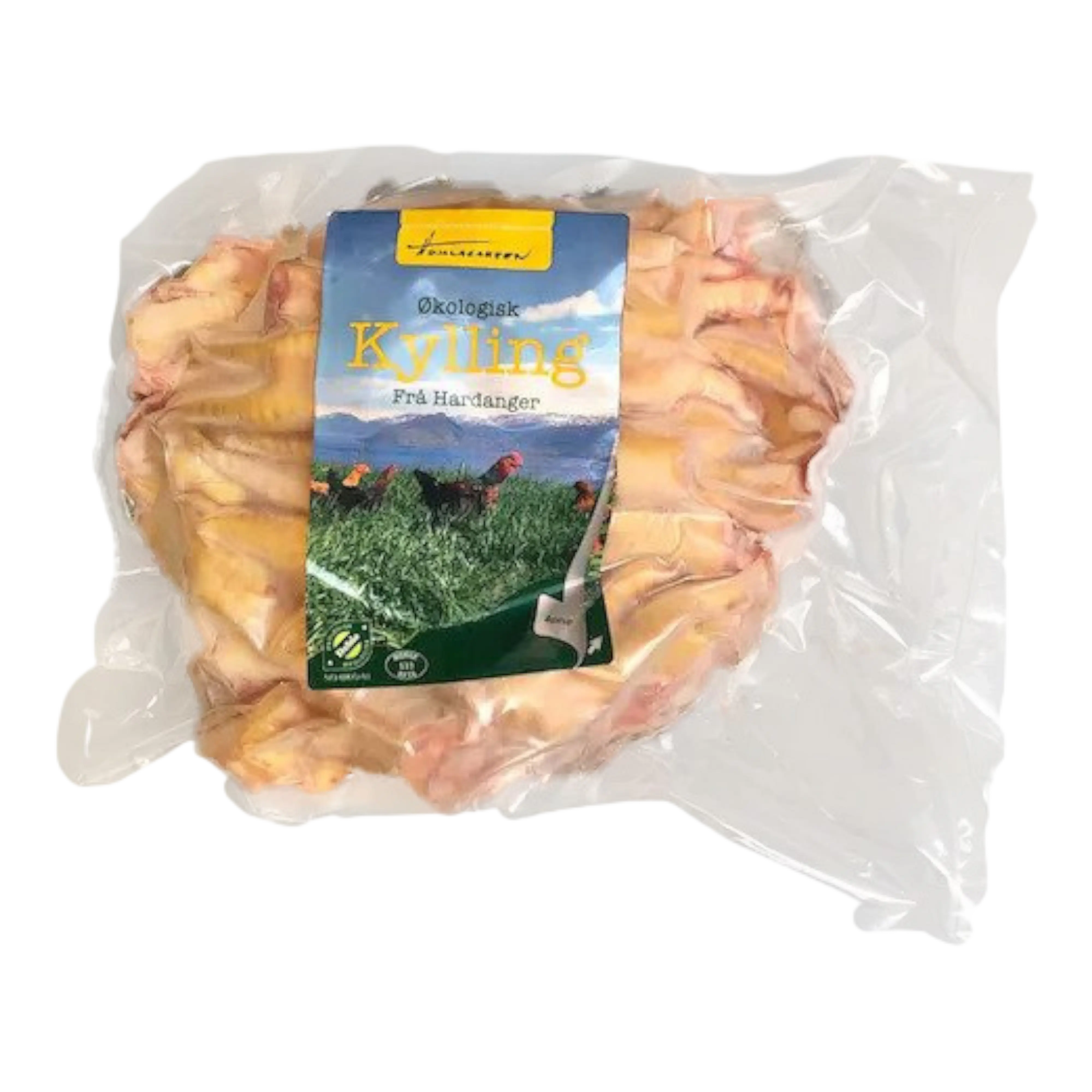 Økologiske kyllingføtter. Består hovedsaklig av hud og bein, og store mengder kollagen. Gir en stiv og næringsrik kraft!