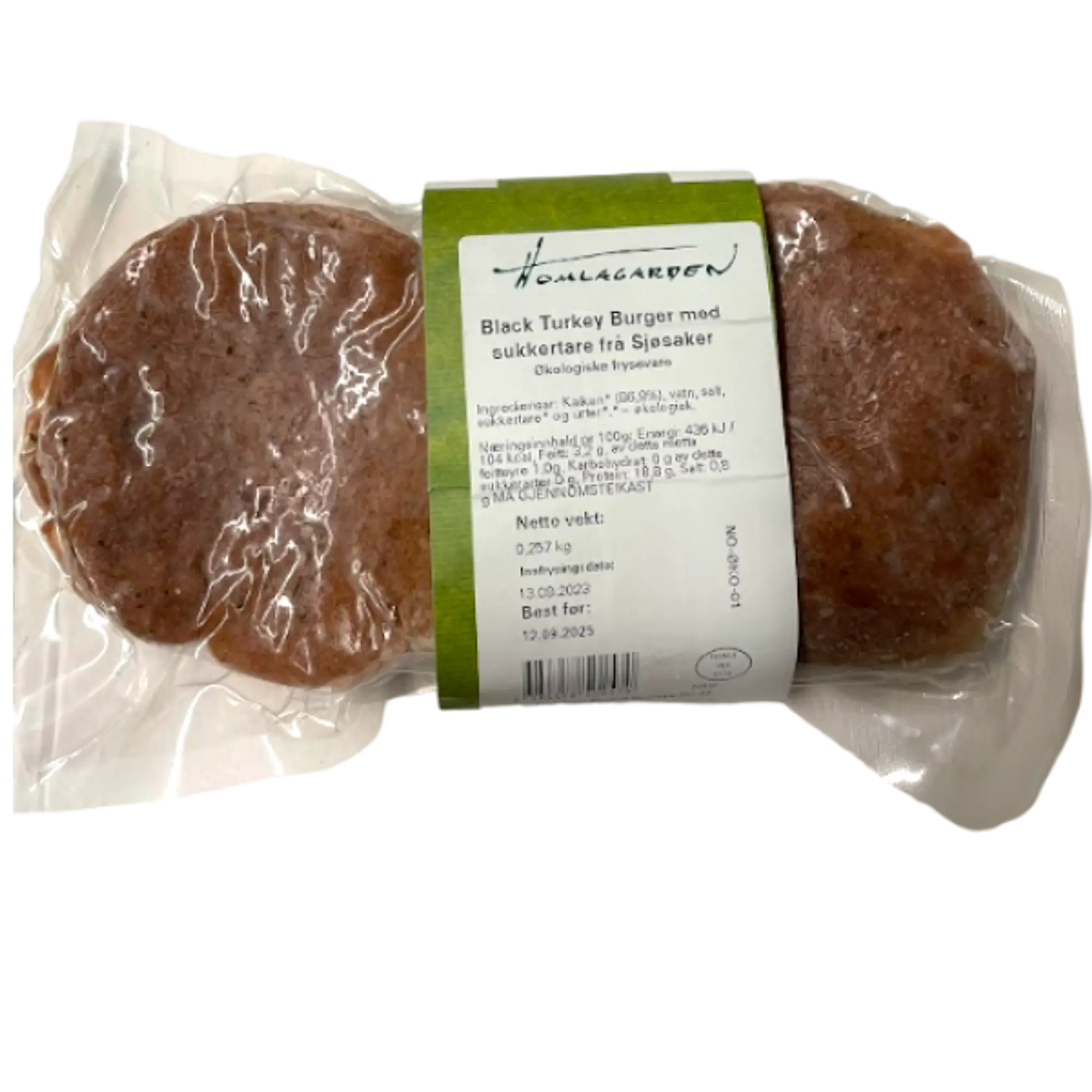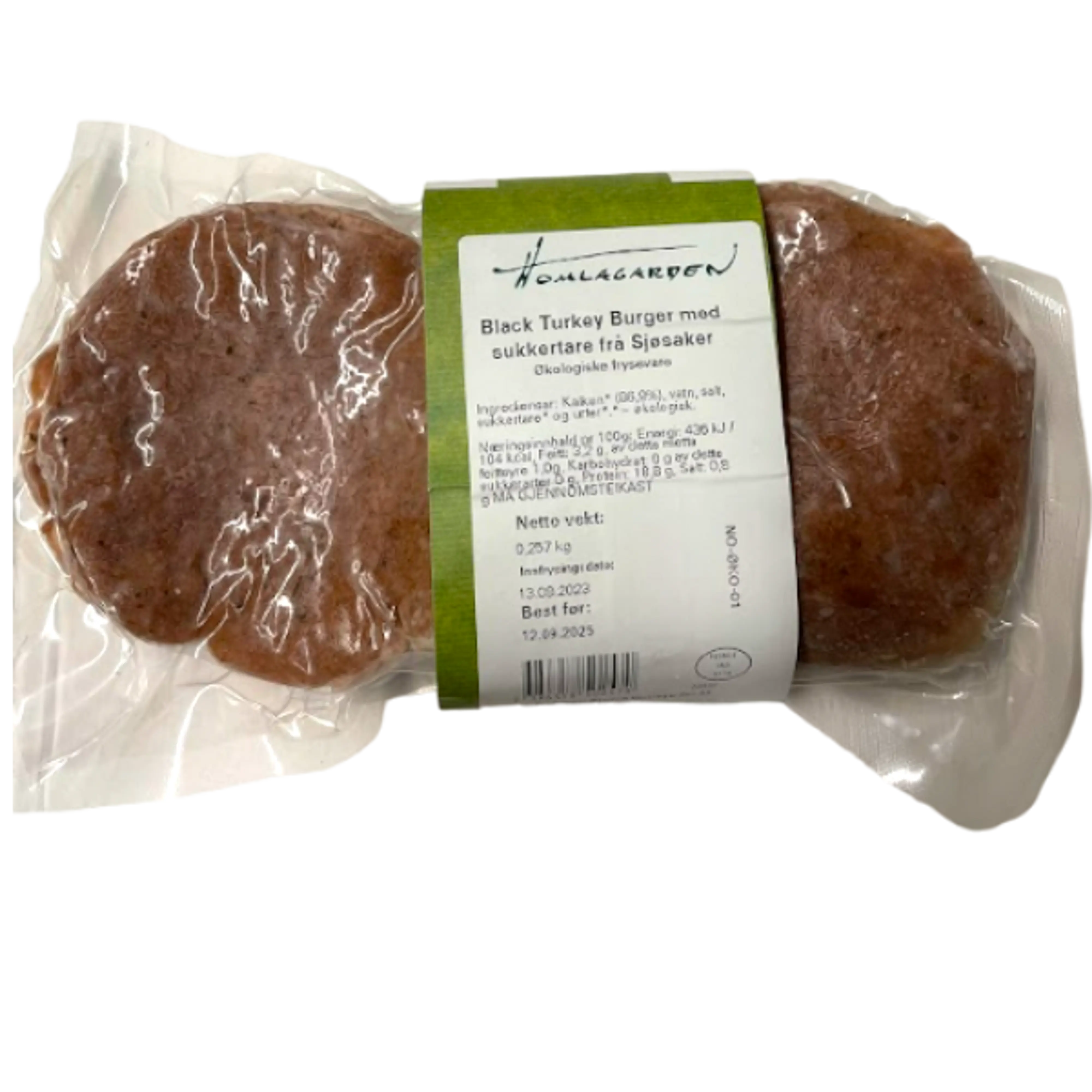 Black Turkey Burger 2-pk fra Homlagarden. Burgerene lages av lårkjøtt fra Homlagardens svarte kalkuner. Den særegne rasen Black Turkey er avlet frem hos Homlagarden, spesielt tilpasset økologisk oppdrett. Kalkunene vokser sakte og har svært fin kjøttfylde med den beste kvalitet og smak. Homlagarden leverer økologiske kylling- og kalkunprodukter av toppklasse. Vinner av norsk måltid i 2018 i klassen 'årets kjøtt' og vinner av 'årets produsent' under Matprisen 2019